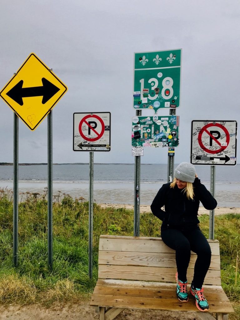 1 300 kilomètres et quelques poussières plus tard – depuis Montréal – j’ai atteint avec émotion le petit village de Kegaska se dressant au bord de l’eau, tout au bout de la mythique route 138. Là, sous la pluie et à travers le grand vent du large, il m’a semblé que la fatigue de ces nombreuses heures de route avaient soudainement été balayée par les bourrasques salées. Et qu’au moment où je demandais à un inconnu de me prendre en photo, assise devant ce fameux panneau FIN recouvert de graffitis et d’autocollants, il y avait quelque chose qui commençait juste pour moi.