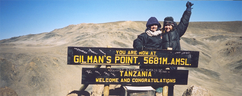 C’est finalement à 8h00 que nous arrivons à Gilman’s Point. Nous sommes à 5 681 mètres, la pancarte nous le confirme. J’éclate à nouveau en sanglot, de soulagement cette fois. Brigitte aussi est bien heureuse, elle qui s’était préparée à se contenter de moins à cause de son asthme. Nous avons maintenant une décision à prendre : nous redescendons ou nous continuons à marcher en direction du cratère et des glaciers deux cent mètres plus loin.